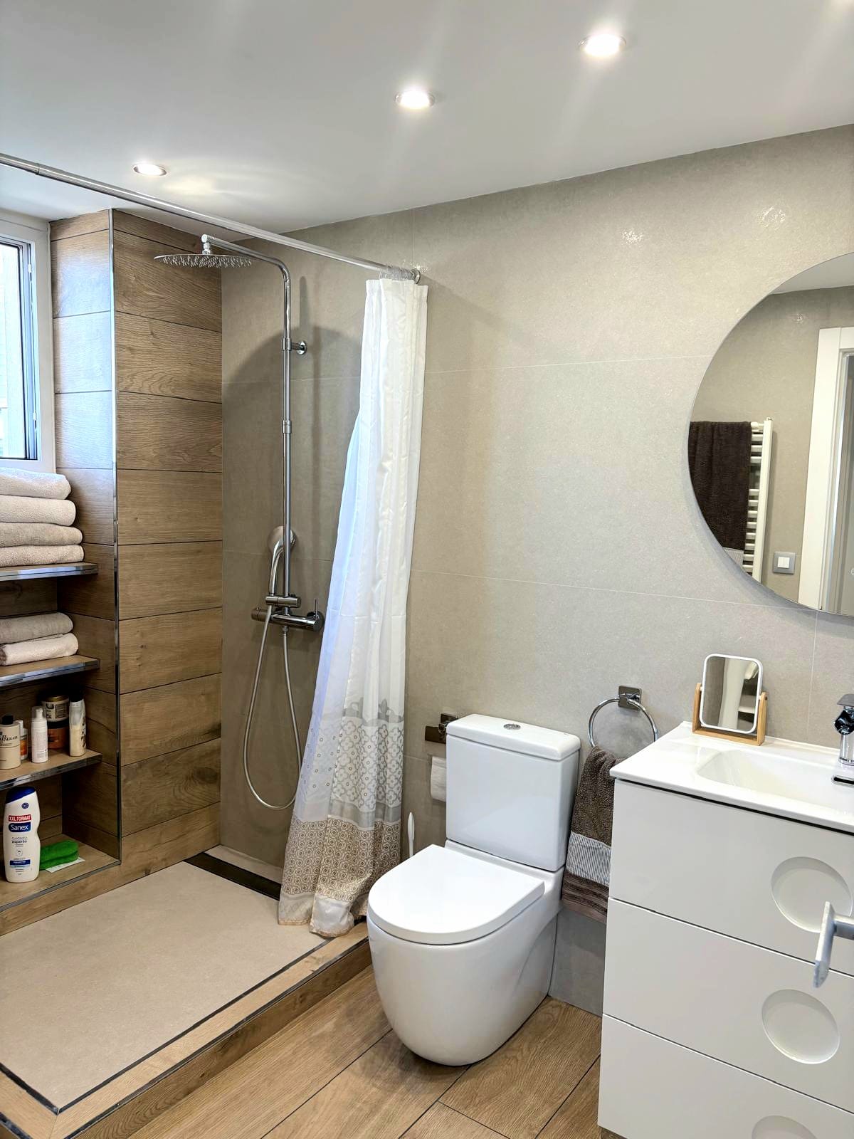 Un cuarto de baño muy luminoso, moderno y equipado.
